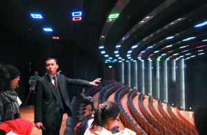 昨日,國家博物館新館內(nèi),一名工作人員在介紹國博影院。