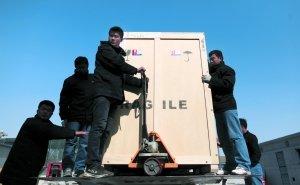 昨日,工作人員將文物從卡車上搬出。當日,新國博首次展覽的珍貴文物運抵國家博物館。記者 浦峰 攝