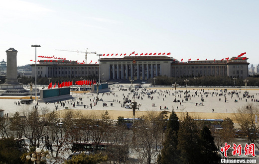 全國兩會召開在即,人民大會堂東門外的廣場上紅旗招展。中新社發(fā) 廖攀 攝