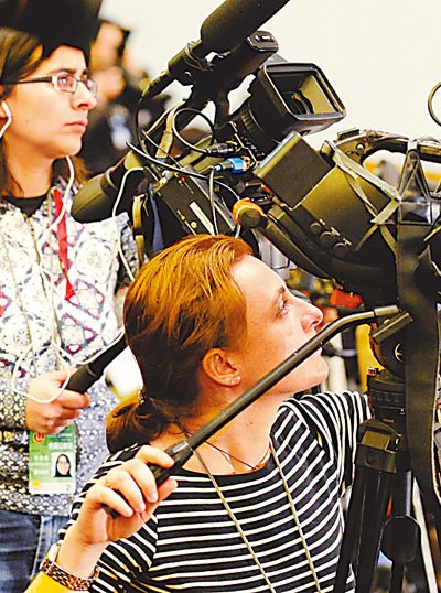3月5日,十一屆全國人大四次會議開幕。圖為外國記者在采訪拍攝。新華社記者 任勇攝