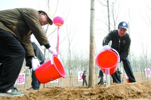 昨天9時,部長們陸陸續(xù)續(xù)來到濱河公園,他們一下車,便直奔植樹地點,揮鍬鏟土,扶苗澆水,短短半天時間,就栽下了2800多株油松、銀杏、白蠟、千頭椿等樹木。