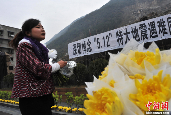 清明節(jié)將近,又度使三年前被大地震毀城的四川省北川羌族自治縣縣城廢墟悲情籠罩,一位少女懷抱特別培植的春菊,前來公墓憑吊。中新社發(fā) 賈國榮 攝
