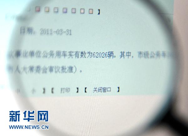 北京市財(cái)政局在網(wǎng)站上公布的“公車”數(shù)量(4月3日攝)。4月1日,北京市財(cái)政局通過官方網(wǎng)站公布,截至2010年底,北京市“公車”實(shí)有數(shù)為62026輛。對(duì)于這次“千呼萬喚始出來”的政府公開行為,網(wǎng)民在肯定之余仍存疑惑:“北京就只有這么點(diǎn)公車?”“公車一年花多少錢是否可以公開?” 新華社記者公磊攝