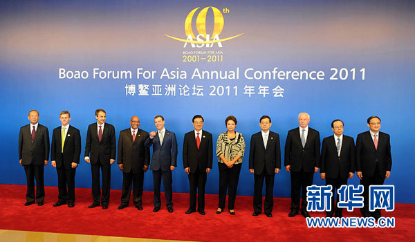 4月15日,中國國家主席胡錦濤與出席博鰲亞洲論壇2011年年會政要合影。 新華社記者 李濤 攝