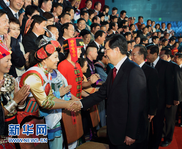 6月12日,第四屆全國少數(shù)民族文藝會演在北京國家體育館隆重開幕。胡錦濤、溫家寶、賈慶林、李長春等出席開幕式文藝晚會。演出開始前,胡錦濤等會見了參加會演的各少數(shù)民族演職人員代表。新華社發(fā)