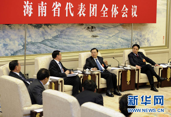 3月11日,中共中央政治局常委、國(guó)務(wù)院副總理張德江參加十二屆全國(guó)人大一次會(huì)議海南代表團(tuán)的審議。 新華社記者謝環(huán)馳攝