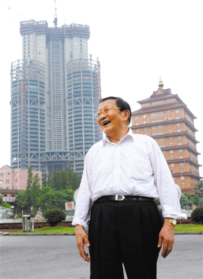 2009年8月12日,吳仁寶在華西村幸福園與村民交談。他的身后是當時正在建設的“華西增地空中新農(nóng)村大樓”。 新華社記者 孫參 攝