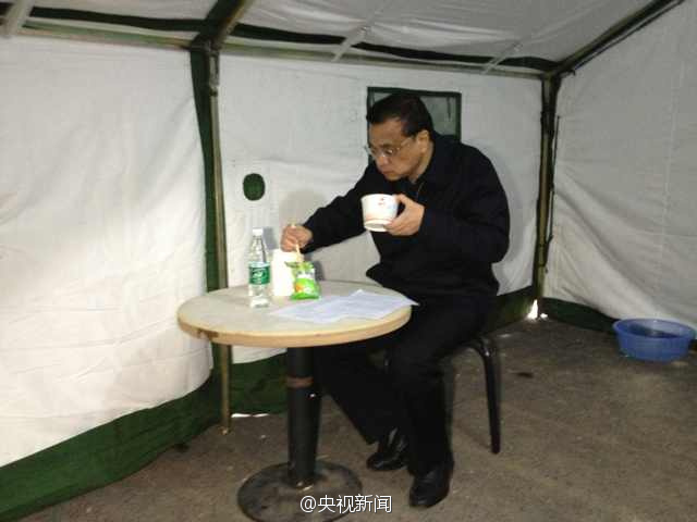 【李克強(qiáng)清晨在帳篷外接受采訪】蘆山的清晨,微涼。不到七點(diǎn),李克強(qiáng)走出帳篷,面容看起來很憔悴。昨晚的繁忙的工作和凌晨發(fā)生的余震令他幾乎沒有休息。他用沙啞的聲音對(duì)記者反復(fù)強(qiáng)調(diào)的仍然是:“現(xiàn)在救人是第一位的!”、“我們要求救援要科學(xué)有效!”