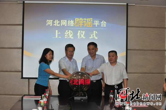 河北省委宣傳部副部長(zhǎng)、省互聯(lián)網(wǎng)信息辦公室主任解永會(huì)(右二),河北日?qǐng)?bào)報(bào)業(yè)集團(tuán)黨委書(shū)記、社長(zhǎng)郭金平(左二),河北省公安廳網(wǎng)絡(luò)安全保衛(wèi)總隊(duì)總隊(duì)長(zhǎng)張文閣(右一),河北省通信管理局通信保障處副處長(zhǎng)李琦(左一)共同啟動(dòng)水晶球,宣告“河北網(wǎng)絡(luò)辟謠平臺(tái)”正式上線(xiàn)。