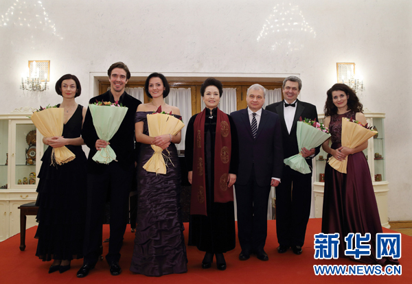 11月19日,國(guó)家主席習(xí)近平夫人彭麗媛應(yīng)邀出席在俄羅斯駐華使館舉行的紀(jì)念柴可夫斯基俄羅斯歌劇晚會(huì)。這是演出結(jié)束后,彭麗媛同俄羅斯歌唱家合影。新華社記者蘭紅光攝