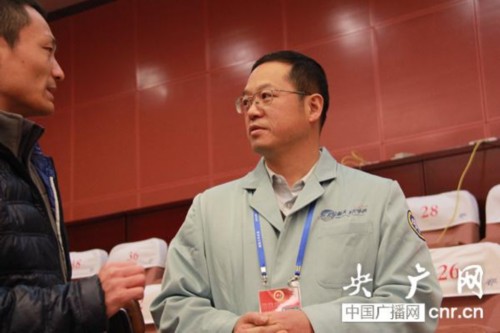 記者白宇在北京飛控中心采訪嫦娥三號(hào)任務(wù)測(cè)控系統(tǒng)專家宋軍(右) 央廣網(wǎng)記者朱虹 攝