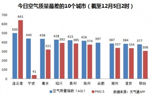 中央氣象臺監(jiān)測顯示,今天白天到夜間,安徽東部和北部、江蘇、上海、浙江北部等大部地區(qū)有中度霾,其中,江蘇等地的部分地區(qū)有重度霾。截至今日早上2時,連云港的AQI(空氣質(zhì)量指數(shù))“爆表”達到500,PM2.5高達641,屬于嚴重污染,成為74個公布PM2.5數(shù)據(jù)城市中空氣質(zhì)量最差的城市。