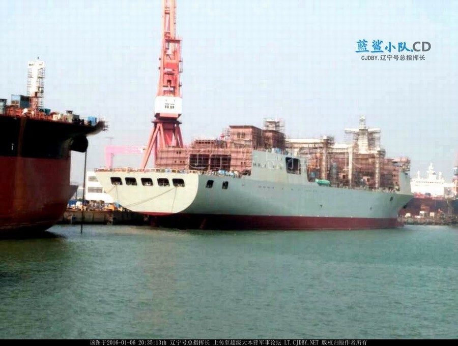國(guó)內(nèi)知名軍事論壇的圖片顯示,一艘國(guó)產(chǎn)大型補(bǔ)給艦已經(jīng)下水,從外形上看該艦與目前已經(jīng)建造服役的903、903A型補(bǔ)給艦有明顯差別。有分析這是我國(guó)正在建造的901型大型綜合補(bǔ)給艦,其排水量預(yù)計(jì)可達(dá)4至5萬(wàn)噸左右。