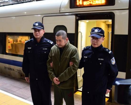 資料圖:2015年11月18日,在漢口火車站,犯罪嫌疑人王某在警方押送下抵達(dá)武漢。據(jù)武漢警方介紹,嫌疑人王某是“獵狐行動(dòng)”開展以來,武漢首個(gè)自愿從西方國(guó)家回國(guó)自首的境外逃犯。此前,追逃專班曾先后10次派人登門探望慰問王某父母,解決其生活困難。新華社記者 饒饒 攝