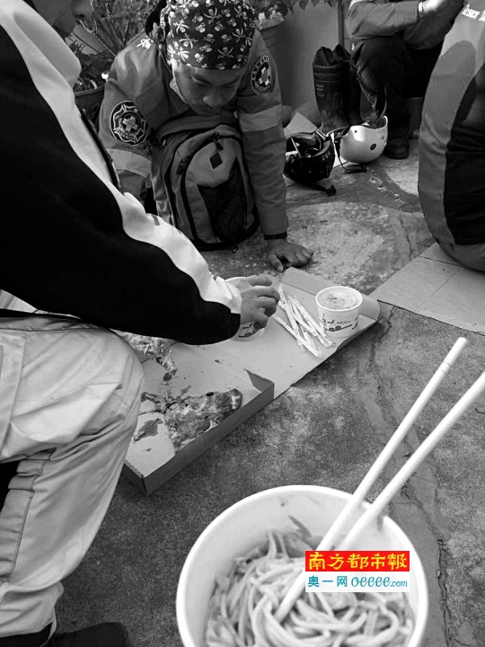 臺南維冠金龍大樓的搜救工作人員正在吃“年夜飯”。 受訪者供圖