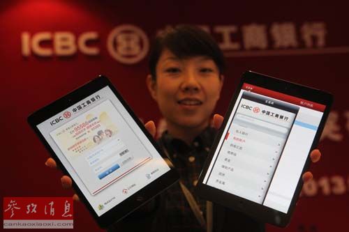 資料圖片:工商銀行工作人員在展示工行移動(dòng)銀行客戶端。