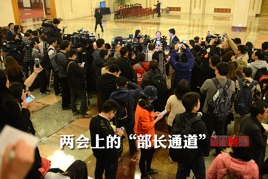 每年兩會,人民大會堂北大廳都是各家媒體派“重兵”把守的“重要關(guān)隘”之一。因?yàn)榘凑諔T例,在人民大會堂北大廳,有一段長約百米鋪就紅毯的路,國務(wù)院各部委主要負(fù)責(zé)人進(jìn)出會場經(jīng)常由此通過,媒體報道時習(xí)慣性地稱之為“部長通道”。圖為3月3日,全國政協(xié)十二屆四次會議在北京人民大會堂開幕,“部長通道”記者云集。 中新社記者 王東明 攝