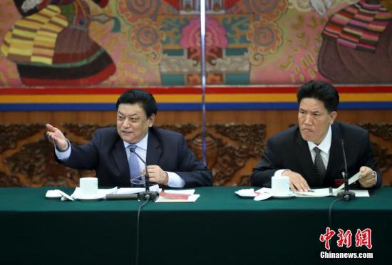 3月7日,出席十二屆全國人大四次會議的西藏代表團舉行全體會議,并對中外媒體開放。全國人大代表、自治區(qū)人大常委會主任白瑪赤林(左),全國人大代表、自治區(qū)主席洛桑江村回答記者提問。中新社記者 杜洋 攝