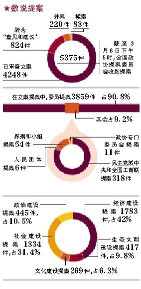 截至3月8日下午5時,共收到提案5375件,提案委員會根據(jù)《政協(xié)全國委員會提案工作條例》進(jìn)行了立案審查。經(jīng)審查,立案4248件,轉(zhuǎn)為“意見和建議”824件,并案220件,撤案83件。