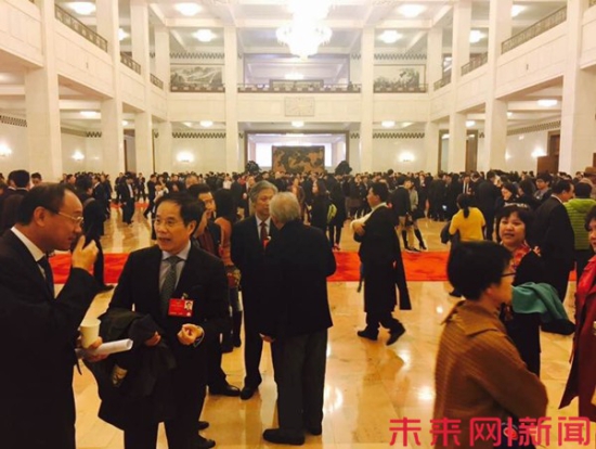 3月14日,全國政協(xié)十二屆四次會(huì)議閉幕后,政協(xié)委員在人民大會(huì)堂大廳內(nèi)交流、告別。未來網(wǎng)記者 任潤波 攝