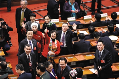 16日,北京人民大會堂,閉幕會前代表爭相合影留念。當(dāng)天上午,十二屆全國人大四次會議閉幕。新京報記者 侯少卿 攝