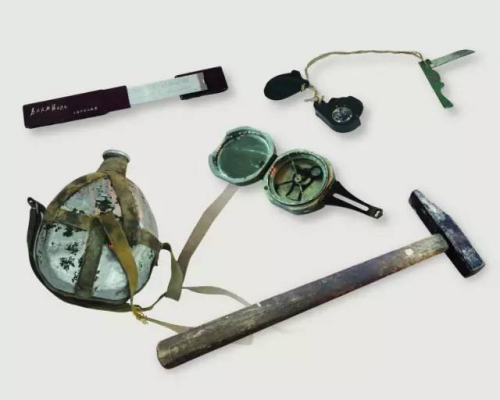 在野外工作時(shí)用過的地質(zhì)錘、羅盤、放大鏡、小刀、計(jì)算尺、水壺。圖據(jù)地質(zhì)出版社