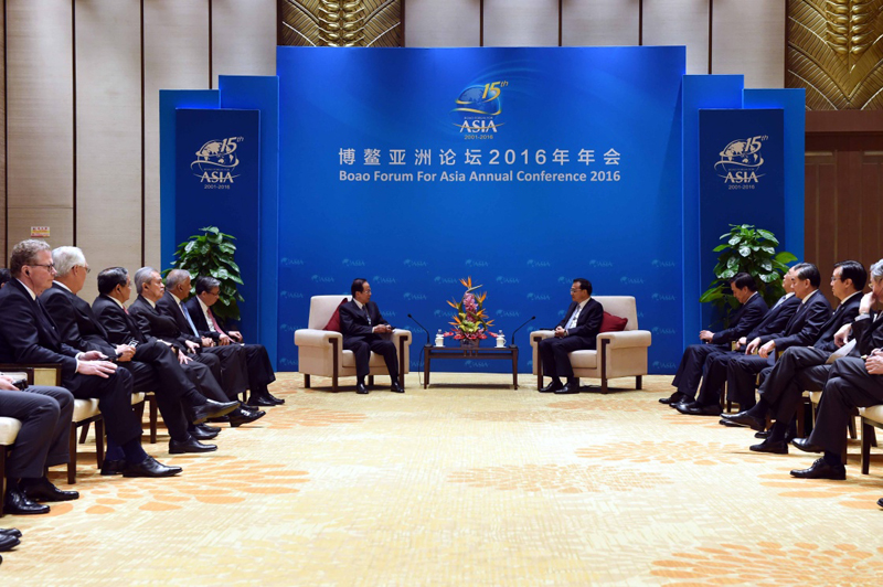 國務院總理李克強在海南博鰲會見博鰲亞洲論壇理事長福田康夫和理事會部分成員。