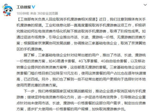 隨著去年京津冀手機漫游費的取消,全國手機漫游費取消或也將成為現(xiàn)實。近日,“取消手機漫游費”的呼聲再起。23日,工信部官方微博發(fā)文表示,將加快取消手機漫游費步伐,目前已取得了階段性成果。