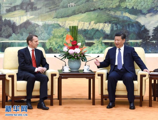 習(xí)近平首先請納雷什金轉(zhuǎn)達(dá)對普京總統(tǒng)的誠摯問候。他說,中俄全面戰(zhàn)略協(xié)作伙伴關(guān)系的高水平發(fā)展符合兩國人民共同愿望,順應(yīng)兩國發(fā)展振興需要,合乎世界和平、發(fā)展、合作、共贏的歷史潮流。我同普京總統(tǒng)達(dá)成共識(shí),下一階段發(fā)展中俄關(guān)系的中心任務(wù),是把兩國高水平的政治關(guān)系優(yōu)勢轉(zhuǎn)化為更多務(wù)實(shí)合作和國際合作成果,更好地造福兩國和兩國人民。今年是《中俄睦鄰友好合作條約》簽署15周年。希望雙方以此為契機(jī),大力弘揚(yáng)條約確立的世代友好理念,為兩國關(guān)系長期健康穩(wěn)定發(fā)展奠定更加堅(jiān)實(shí)的社會(huì)和民意基礎(chǔ)。