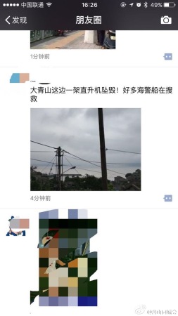 國家海洋局東海分局7日晚通報,當日,中國海監(jiān)一架直升機在執(zhí)行飛行任務返航途中失聯(lián)。傍晚,搜尋人員在舟山朱家尖大青山山頂發(fā)現(xiàn)飛機殘骸,四位機組人員被發(fā)現(xiàn)遇難。圖為6月7日,搜救人員前往失事海域搜尋(手機拍攝)。 新華社發(fā) 圖片來源:新華網