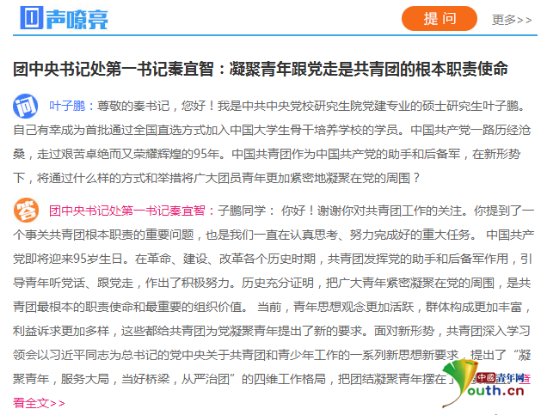 團中央書記處第一書記秦宜智通過“青年之聲”回答中共中央黨校研究生葉子鵬的提問。網(wǎng)頁截圖
