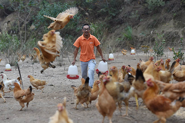 安徽岳西農(nóng)村淘寶合伙人楊凱林路過村民的雞場(chǎng)時(shí)幫著送水(照片由本人提供)