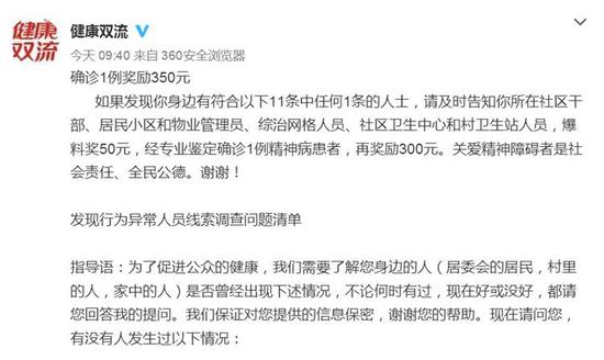 消息稱,如果發(fā)現(xiàn)身邊有符合以下11條中任何1條的人士,請及時告知所在社區(qū)干部、居民小區(qū)和物業(yè)管理員、綜治網(wǎng)格人員、社區(qū)衛(wèi)生中心和村衛(wèi)生站人員,爆料獎50元。如果經(jīng)專業(yè)鑒定確診1例精神病患者,再獎勵300元。