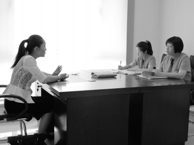 孟蘭星(右一)和同事在向當(dāng)事人闞女士了解案情。