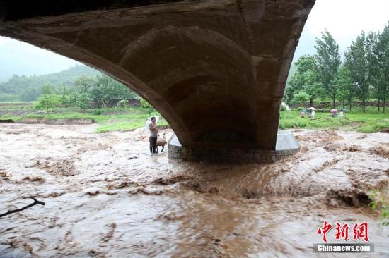 7月19日下午,河南省濟源市,受強降雨影響,當?shù)鼐爬餃虾铀蜐q,一名正在九里溝引沁渠橋下放羊的村民和20多只山羊,被猛漲的洪水困在河道,無法回到岸上,F(xiàn)場,滾滾河水沖擊著橋墩,發(fā)出轟隆隆的響聲,水位還在不斷上漲,情形十分危急。當?shù)叵姥杆俪鰟,在洪水里救人又救羊?古少杰 攝