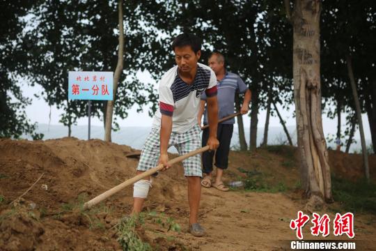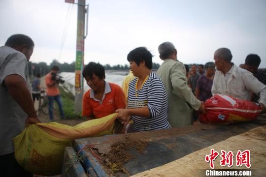 饒陽(yáng)縣村民自發(fā)組織裝填沙土、背運(yùn)沙袋護(hù)衛(wèi)堤防。