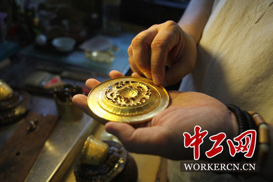 在一個幾十平方米的車間內(nèi),沈國興正在制作一組婚禮上需要使用的黃金擺件!巴瓿梢患芳炎,少則數(shù)周,多則要數(shù)年。金匠的日常工作,單調(diào)枯燥。每天榔頭敲個幾萬遍是家常便飯!鄙驀d說:“跟我同一批進(jìn)來的,就剩我一個了。許多人承受不住這份工作的枯燥與乏味,紛紛轉(zhuǎn)行跳槽!