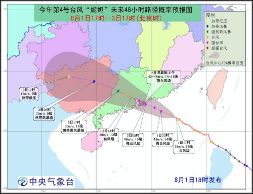 今年第4號臺風“妮妲”于7月30日17時在菲律賓以東洋面上生成,此后向西北方向一路奔襲,31日8時加強為強熱帶風暴,23時加強為臺風,8月1日凌晨轉入中國南海北部海域。