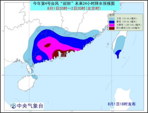 從風力來看,根據(jù)預報,8月1日20時至2日20時,南海北部的大部海面、廣東中東部沿海及珠三角地區(qū)將有9-12級大風,“妮妲”中心經過的附近海面和地區(qū)風力13-15級,陣風可達16級。從降水來看,廣東珠三角及東部沿海地區(qū)局地有特大暴雨(250~350毫米)。