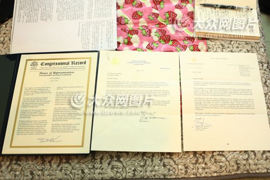 這次與王成漢見(jiàn)面,瑪麗還帶來(lái)了一份特殊的禮物。它們是來(lái)自美國(guó)駐中國(guó)大使館的大使馬克斯·西本·鮑克斯(Max Sieben Baucus)和州參議院主席斯蒂芬·斯威尼(Stephen Sweeney)的公告與禮物;一些當(dāng)年被從濰縣集中營(yíng)解救出來(lái)的難民寫(xiě)給王先生的感謝信;美國(guó)代表唐納德·諾克羅斯(U.S. Rep Donald Norcross)也因王先生的“無(wú)私的行為與貢獻(xiàn)”將其姓名寫(xiě)進(jìn)了國(guó)會(huì)記錄,旣悓⑦@些信件親手交到王成漢手中,兩位老人戴上老花鏡,認(rèn)認(rèn)真真地翻看起來(lái)。王成漢用顫抖的手指撫摸著這些信件,忍不住輕輕讀出了聲。
