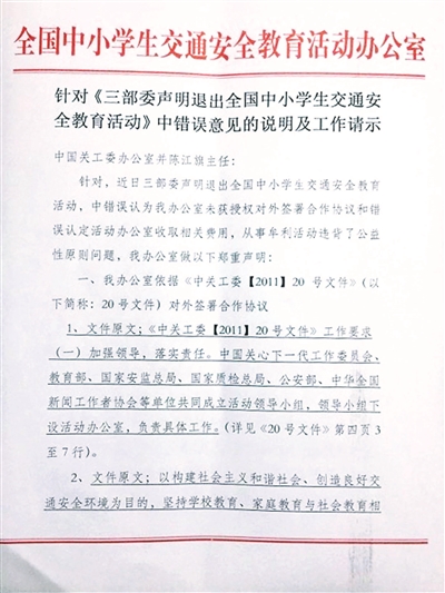 這份名為“針對(duì)《三部委聲明退出全國中小學(xué)生交通安全教育活動(dòng)》中錯(cuò)誤意見的說明及工作請(qǐng)示”中,首先回應(yīng)了“未獲三部委授權(quán)”的質(zhì)疑,稱安全教育辦公室是依據(jù)中國關(guān)工委[2011]20號(hào)文件對(duì)外簽署的協(xié)議,“按照指導(dǎo)思想聯(lián)合社會(huì)各界共同開展學(xué)生教育工作,為明確合作雙方的責(zé)、權(quán)、利,必然要簽署合作協(xié)議!