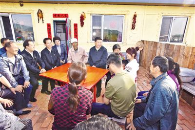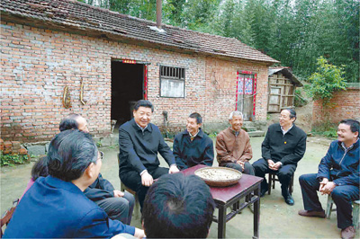 4月24日至27日,習(xí)近平在安徽調(diào)研。這是4月24日下午,習(xí)近平在六安市金寨縣花石鄉(xiāng)大灣村向村民們了解脫貧工作情況。新華社記者 李學(xué)仁攝