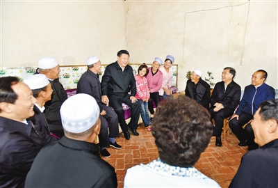 7月18日至20日,習(xí)近平在寧夏調(diào)研考察。這是7月18日下午,習(xí)近平在固原市涇源縣大灣鄉(xiāng)楊嶺村村民馬克俊家同一家人和村民代表親切交談。新華社記者 李 濤攝