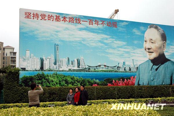 資料圖片:2008年12月13日,人們?cè)谏钲诟L镏行膮^(qū)的鄧小平畫(huà)像前留影。新華社記者 彭勇攝