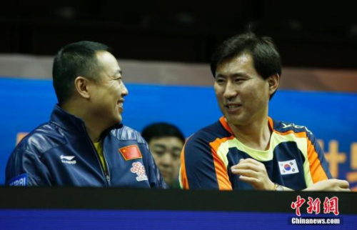第53屆世界乒乓球錦標賽賽場邊,正在指導(dǎo)中韓混雙組合的中韓雙方教練劉國梁以及安宰亨(右)輕松交談。 中新社發(fā) 劉關(guān)關(guān) 攝