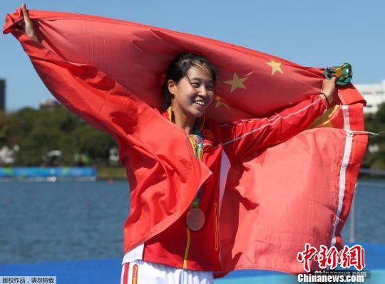 當(dāng)?shù)貢r間8月13日,里約奧運女子單人雙槳決賽,中國選手段靜莉以7分24秒13的成績摘得銅牌。圖為段靜莉身披國旗展示銅牌。