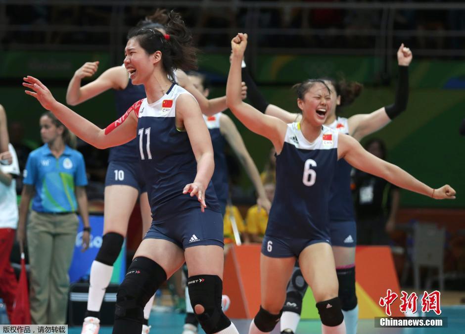 當(dāng)?shù)貢r間8月18日,2016里約奧運會女排半決賽,中國隊3:1戰(zhàn)勝荷蘭隊晉級決賽。這是中國女排時隔12年再次進(jìn)入奧運決賽。圖為中國姑娘慶祝勝利。
