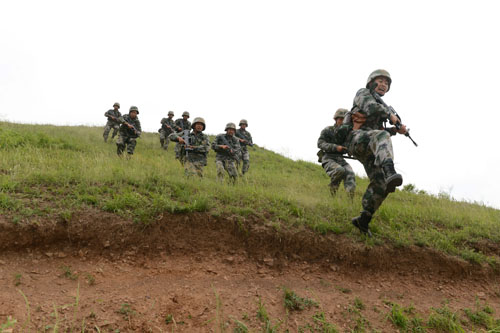 資料圖:陸軍第39集團(tuán)軍某紅軍旅官兵在演習(xí)中發(fā)起沖鋒(2016年5月14日攝)。