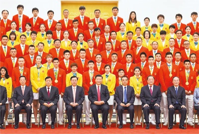 8月25日,黨和國家領(lǐng)導(dǎo)人習(xí)近平、李克強(qiáng)、張德江、俞正聲、劉云山、王岐山、張高麗等在北京人民大會(huì)堂會(huì)見第31屆奧林匹克運(yùn)動(dòng)會(huì)中國體育代表團(tuán)全體成員。新華社記者蘭紅光攝