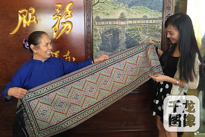 8月30日,國家級非遺項目侗錦代表性傳承人粟田梅和侄女一起向記者展示侗錦產(chǎn)品。侗錦自古以來以母女間傳承為主,一方侗錦,連接起兩代侗家女對這項傳統(tǒng)技藝生生不息的熱愛。千龍網(wǎng)記者 包萌 攝